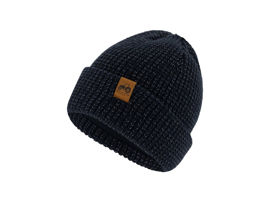 Tmavomodrá čepice na zimu. Příjemný elastický materiál se štítkem traktoru na okraji čepice.