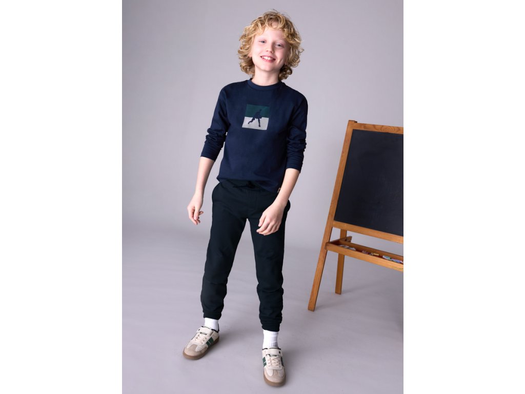 Tepláky z počesané teplákoviny. V pase pohodlný lem s tkanicí. Nohavice zakončeny také do lemu. Na předním díle naznačený punt prošitím a po bocích kapsy. Extra odolná kolena. Na zadku je jedna kapse.