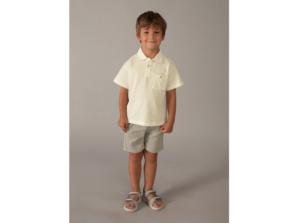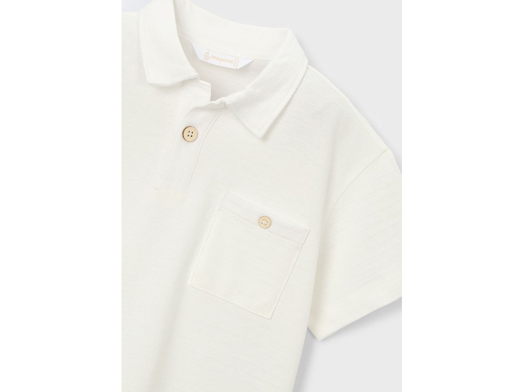 Polo triko ve smetanové barvě. Vzor na triku je jemný proužek vestejné barvě. Po bocích malé rozparky.