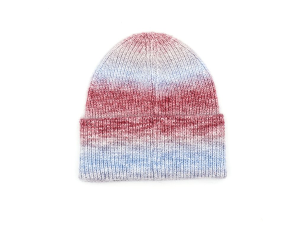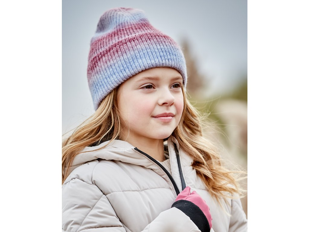 Čepice růžovomodré barvy proužek.