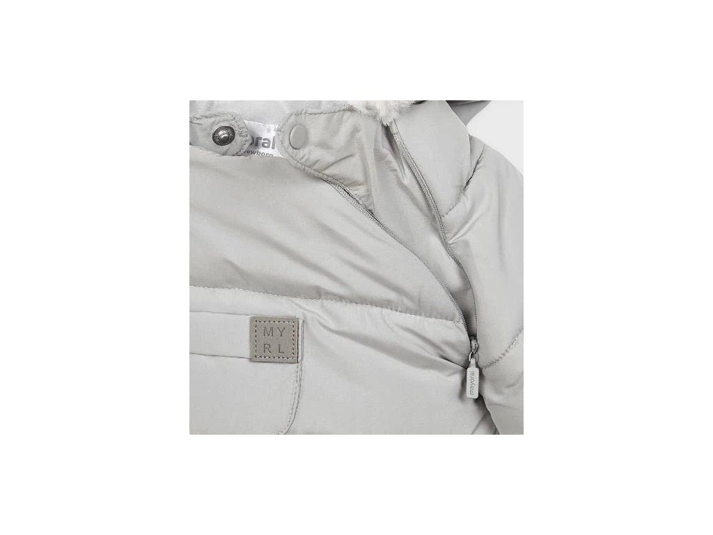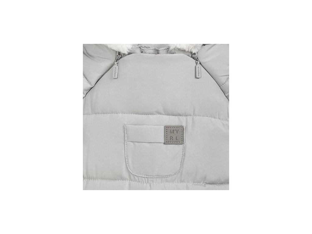 Kombinéza vyteplená a s podšívkou z jemného veluru ve stejné barvě. Světle šedá, prošívaná na přední díle s kapsičkou. Po bocích jemný zipy s možností rozepnutí až ke kolínkům pro snadné oblékání. Kapuce olemovaná krémovou kožešinkou. Rukavičky i bačkůrky přichyceny suchým zipem s poutkem.
