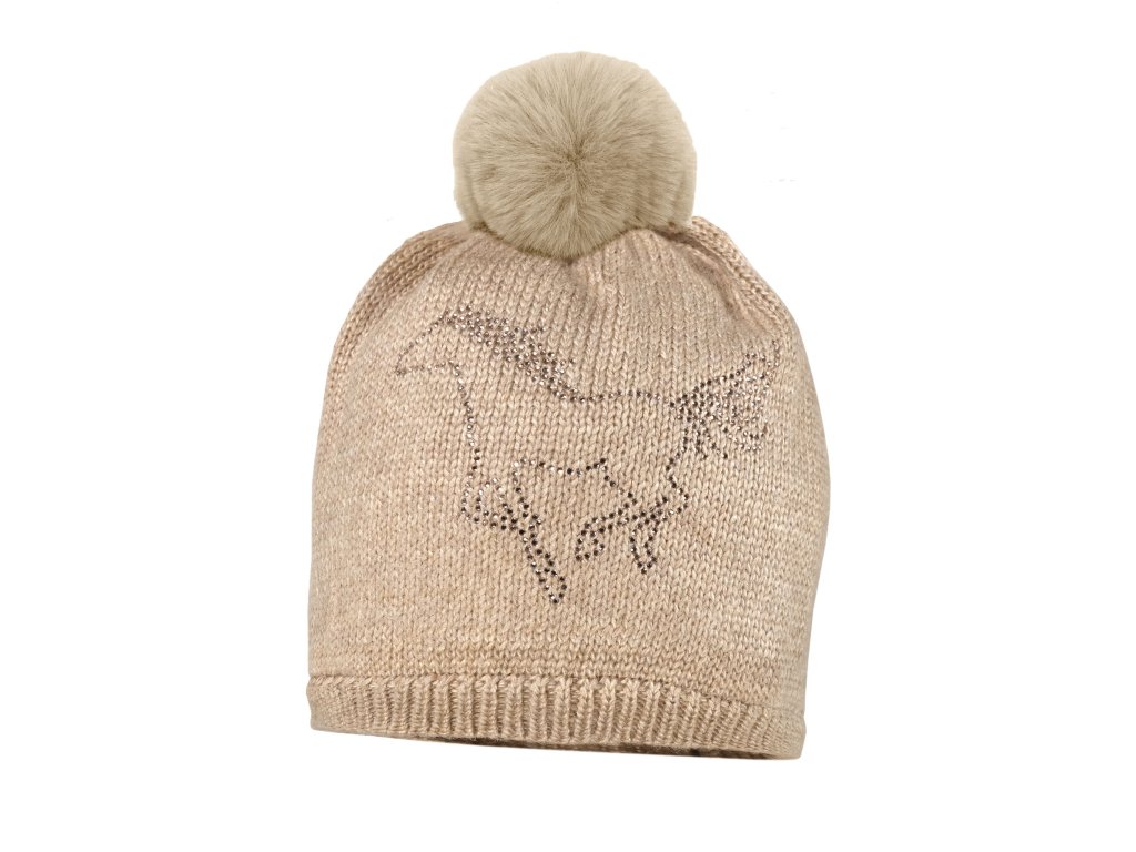 Čepice s příměsí vlny a bambulí v béžové barvě.