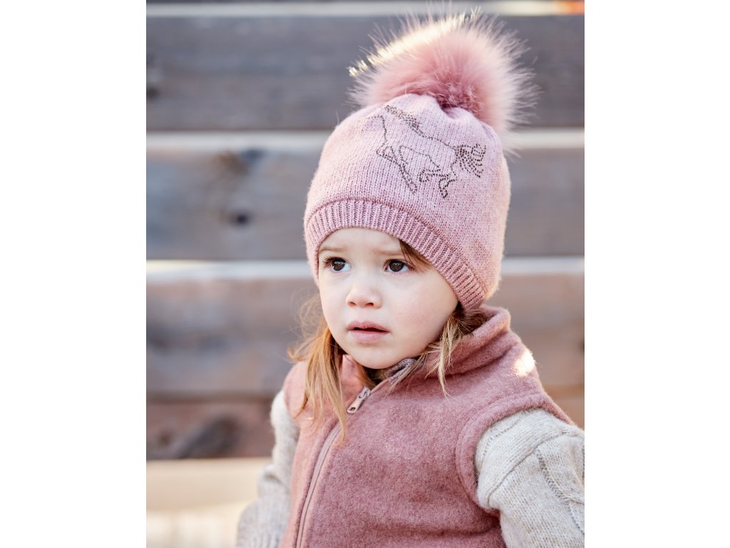 Čepice s příměsí vlny a bambulí v růžové barvě.