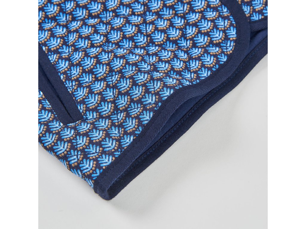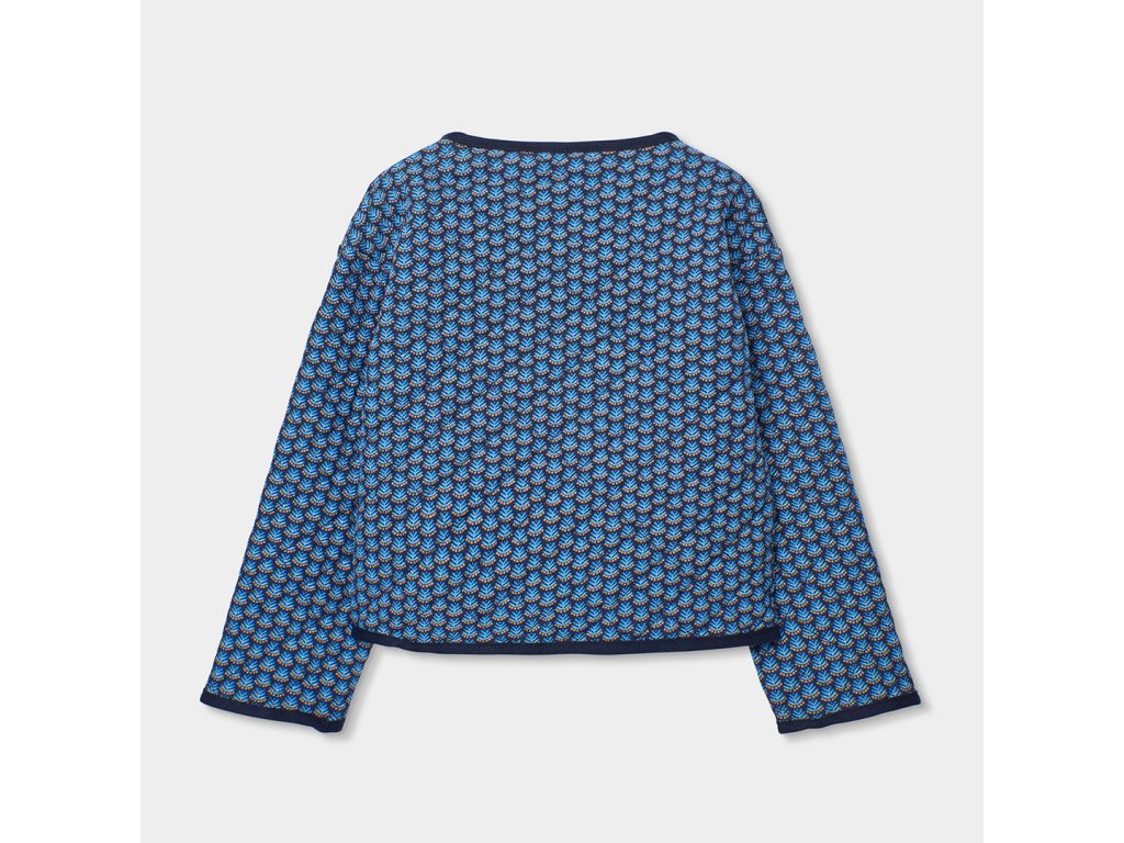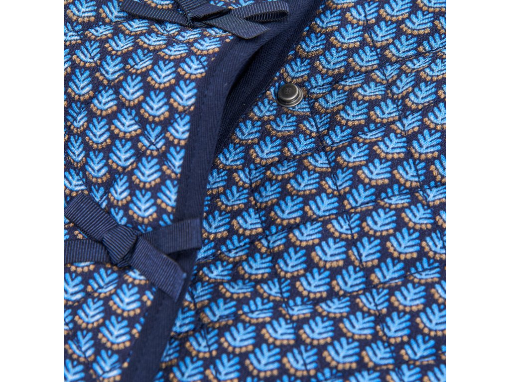 Prošívaný kabátk se zajimavým tiskem v modré barvě. Kabátek je na rozepínání na druky. Na předním díle vsazené kapsy a drobné mašličky. Okraje kabátku a kapsy jsou olemované tmavomodrou látkou. Jako dělaný k širokým kalhotům. Je to nadčasový a nepřehlédnutelný kousek, který musíte mít.