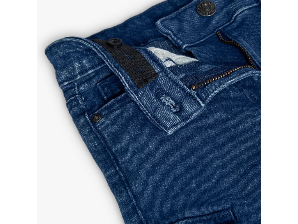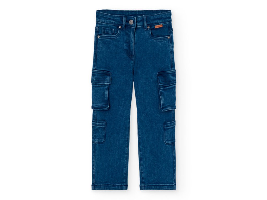 Kalhoty rovného střihu středně modré barvy. V pase možnost stažení na gumu a knoflíček.