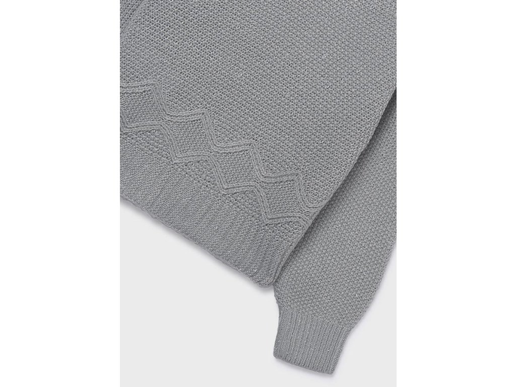 Světle šedý svetr se stříbrným metalickým vláknem. Má kulatý výstřih ke krku. Pletený plastickým vzorem. Příjemný na omak.