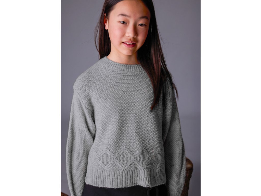 Svetr je zakončený do rovyny vzorečkem a po boku s rozparky.