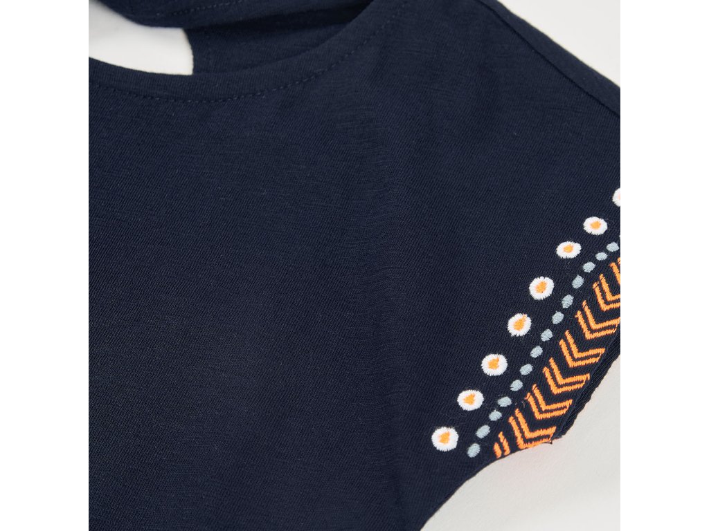 Triko alá tunika v pase nabíraná se vsazenými kapsy. Spadený rukáv ukončen vyšívanou bordurou. Na zadní díle u krku prostřih.