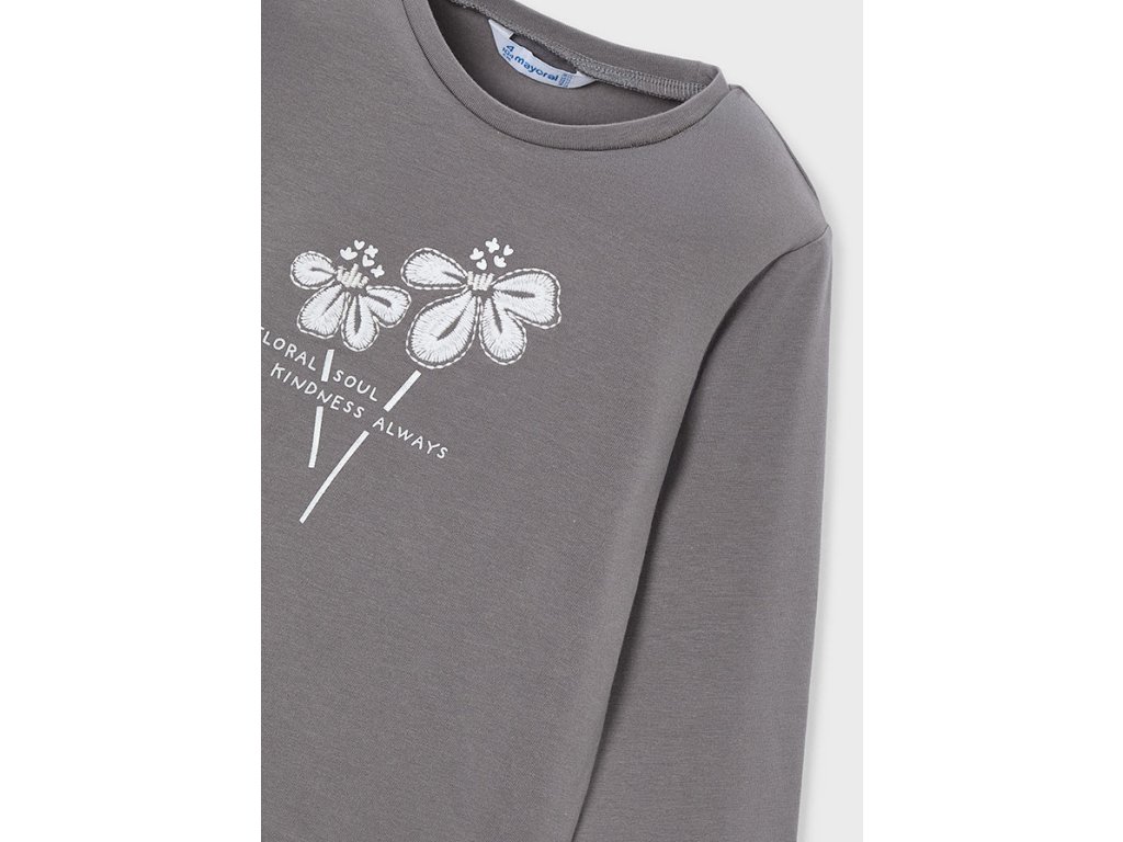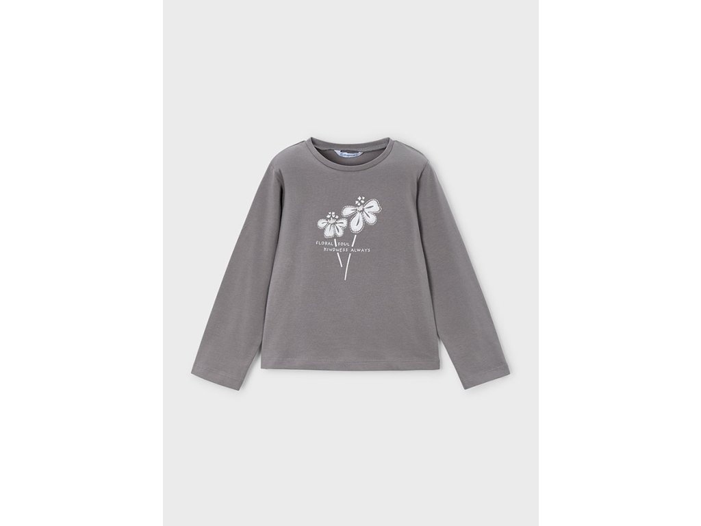 Klasické triko v šedé barvě. Na přední díle vyšívaná aplikace květin v kombinaci s potiskem.
