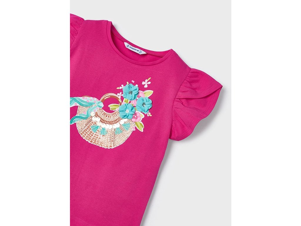 Dívčí triko výrazné růžové barvy s volánkovým rukávkem. Na předním díle je ozdobný potisk se zlatými flitry.