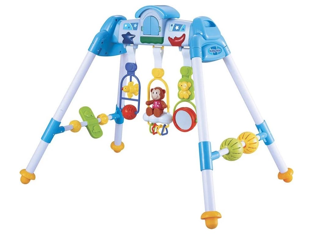 Dětská, hrající přenosná hrazdička s barevnými chrastítky a hračkami. Vrchní panel hrá různe melodie, hvězdička s měsíčkem svítí a blikají. Na panel lze umístnit 3 visíci hračky s chratítky. Po zatáhnutí prostřední hračky se aktivuje hrací modul, začne hrát melodie a z domečku vykoukne zvířátko. Hrazdička učí dítě uchopení a pohybu. Je určena pro děti od 3 měsíců. Baterie (3x AA) nejsou součástí balení.