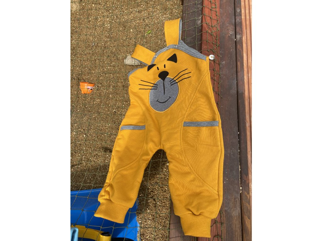 Laclové tepláky hořčicové barvy s výšivkou kočky.