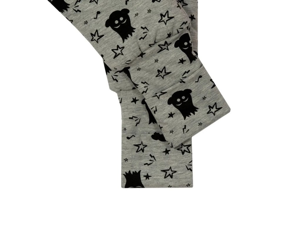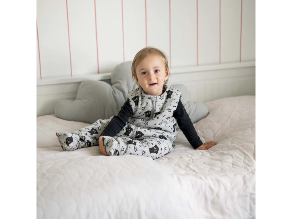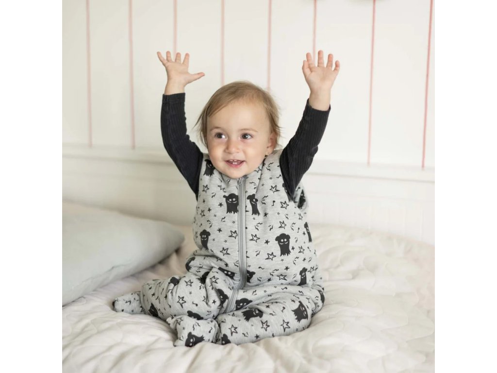 Krásný spací pytel značky Esito v šedé barvě a s potiskem černých strašidýlek.