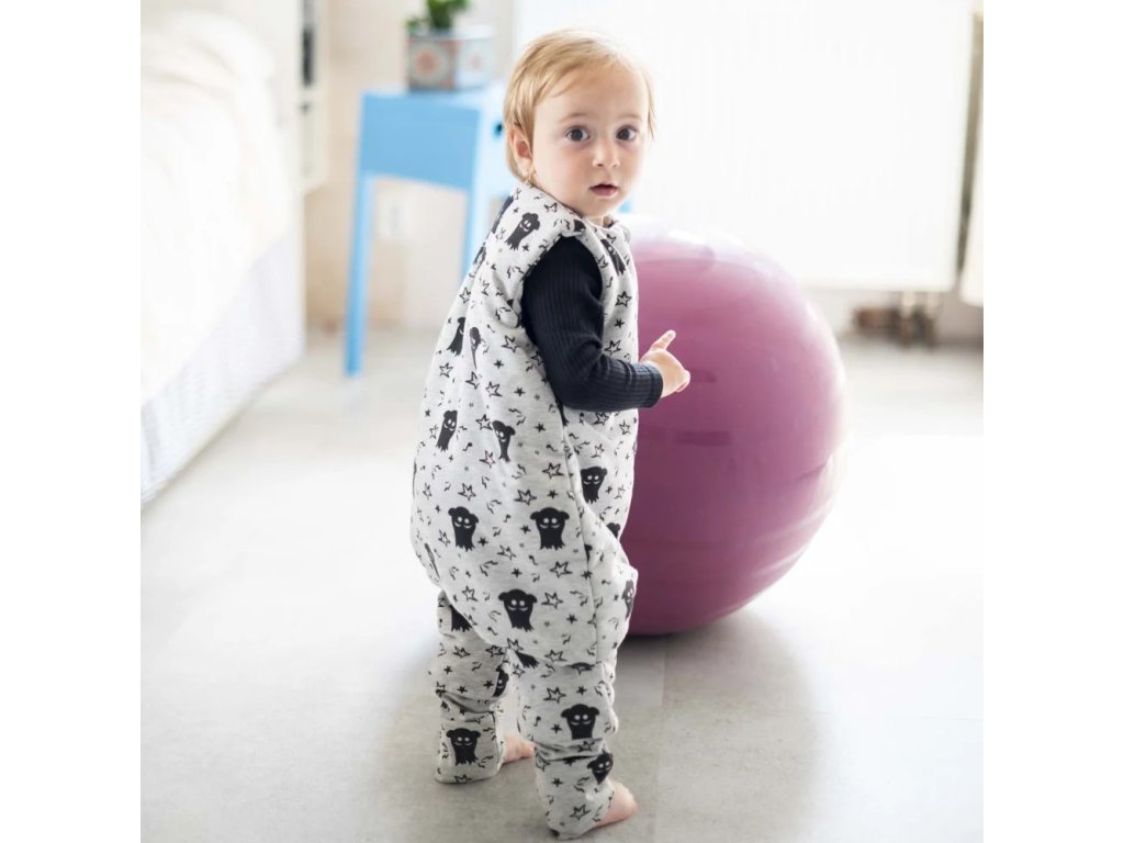 Měkký a pružný spací pytel s nohavicemi, které mají dlouhé manžety. Díky nim dobře regulujete délku. Na manžetě je krytka, kterou můžete přetáhnout přes chodidla a nahradit tím ponožky. V noci můžete odkrýt a nebo ponechat podle toho jestli je dítěti teplo nebo chladno.