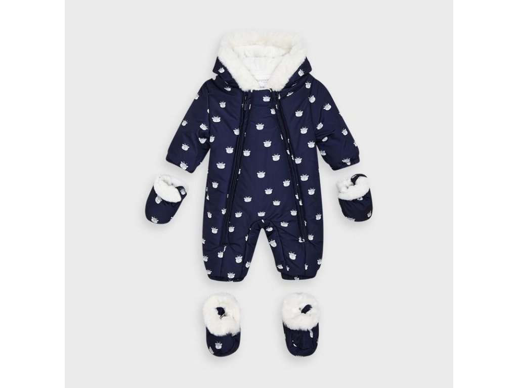 Tmavomodrá kombinéza s potiskem zvířecích hlaviček.  Kapuce olemovaná příjemnou kožešinkou. Podšívka příjemný velur ve smetanové barvě. Kombinéza je včetně botiček a rukaviček, které jsou přichyceny poutkem a suchým zipem.